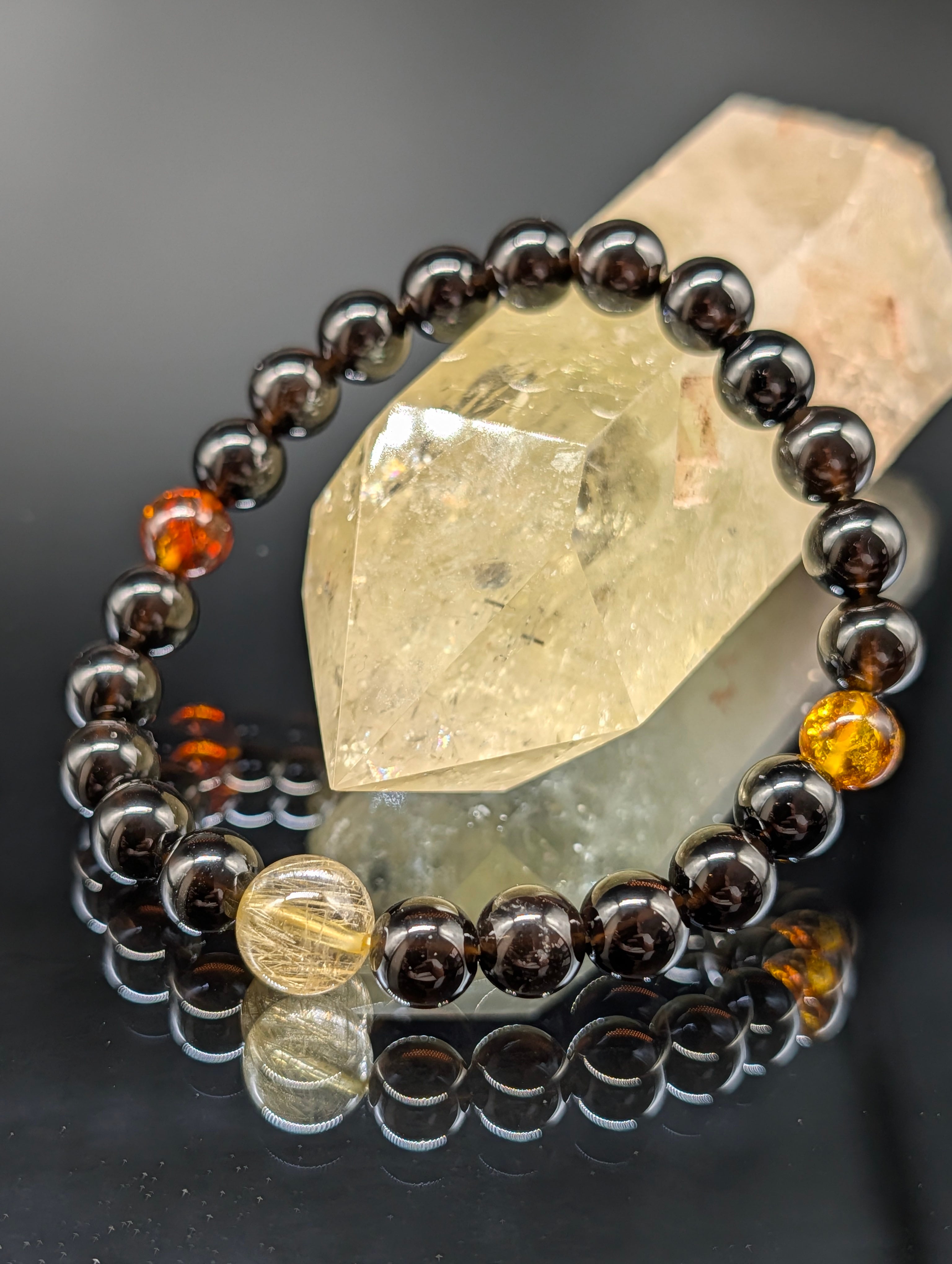 【パワーストーン】モリオン・ルチルクォーツ・アンバー(天然琥珀)・8mm【親玉10mm】ブレスレット 【高品質・金運・健康・願望実現・鑑別済み】