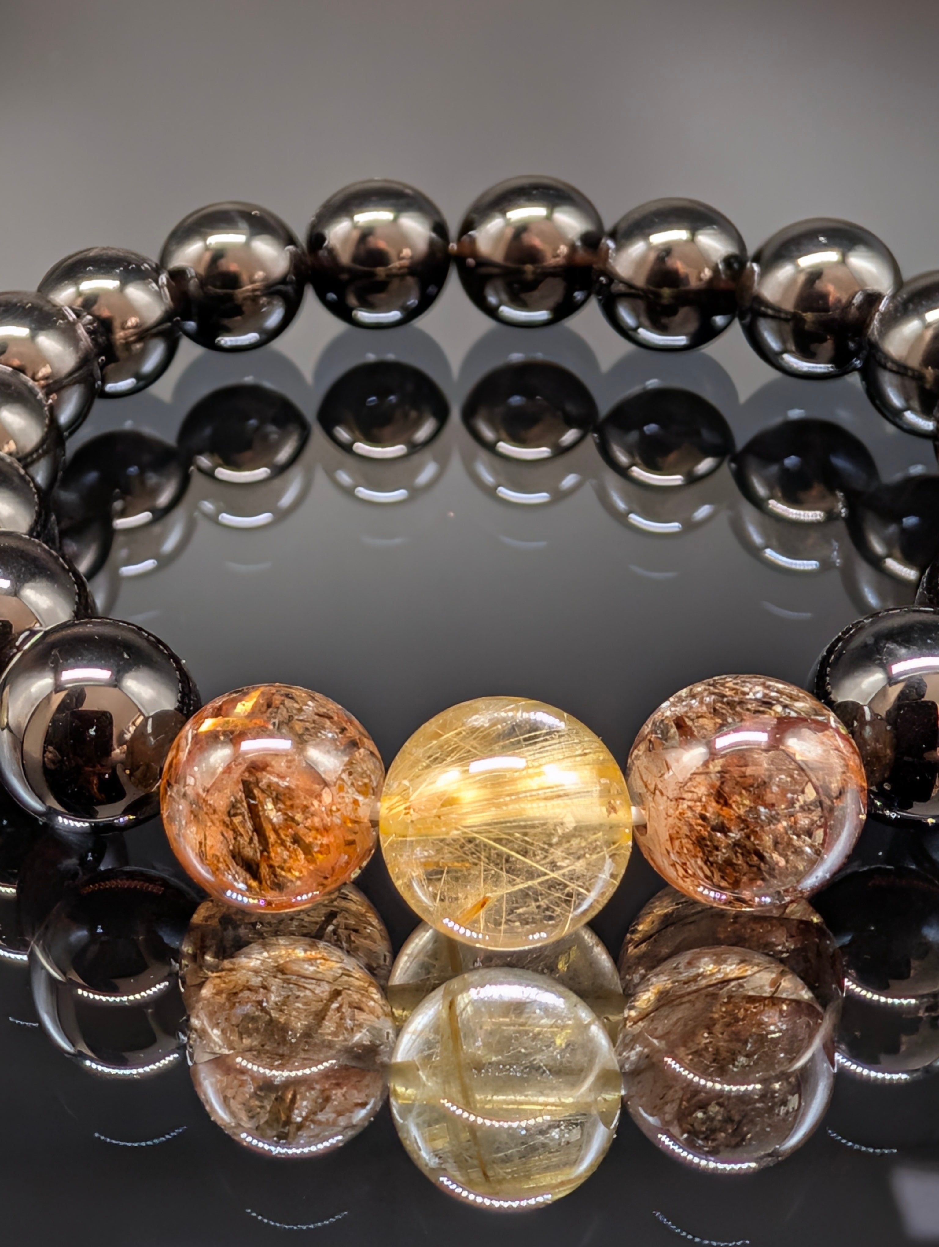高品質のゴールドルチルクォーツと、ブラウンルチル、モリオン(黒水晶)の組み合わせです。