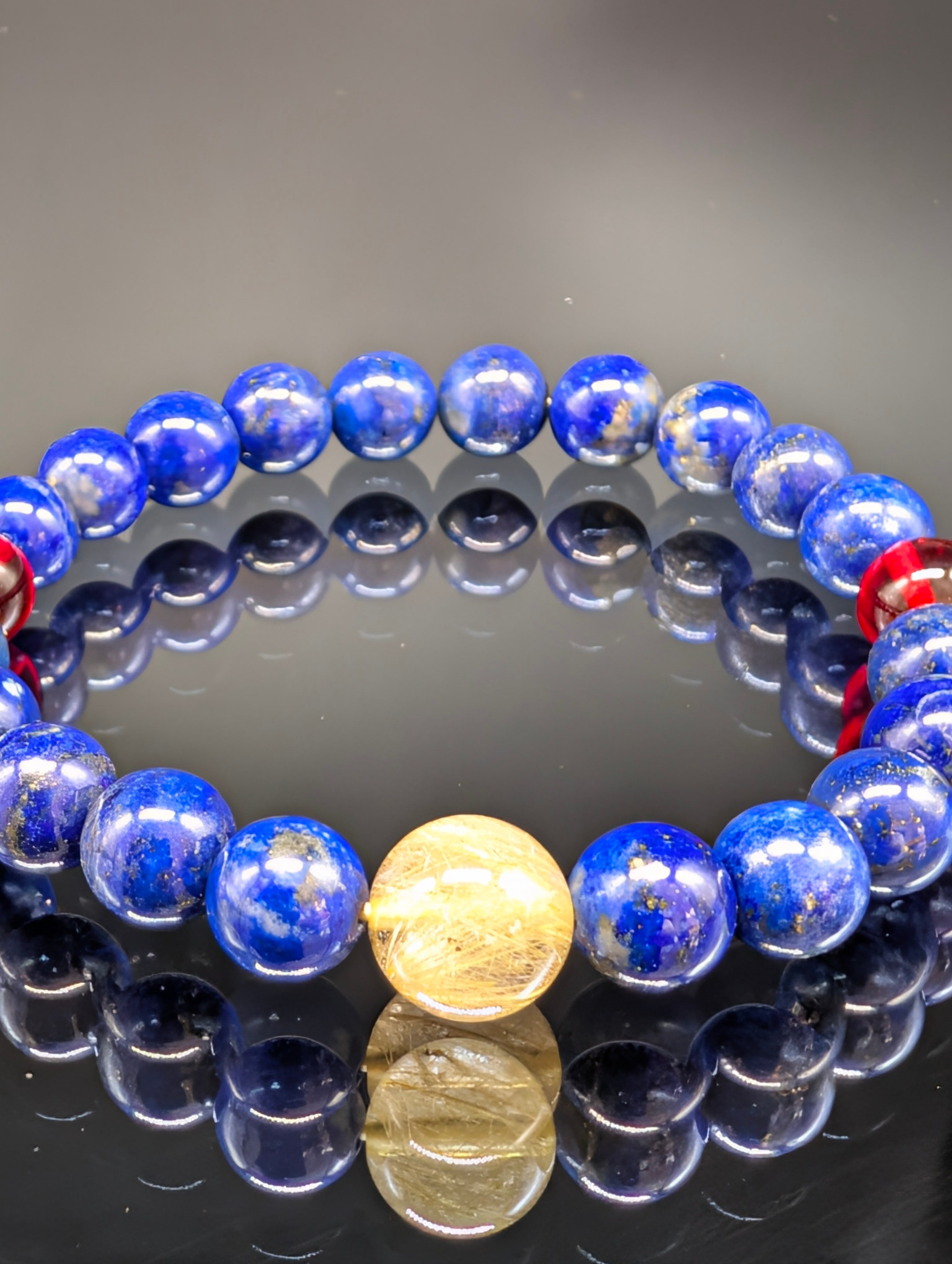 【パワーストーン】ルチルクォーツ レッドアンバー(琥珀) ラピスラズリ 8mm 親玉10mm (高品質) 親玉10mm ブレスレット 【強運・金運上昇・願望実現・健康】