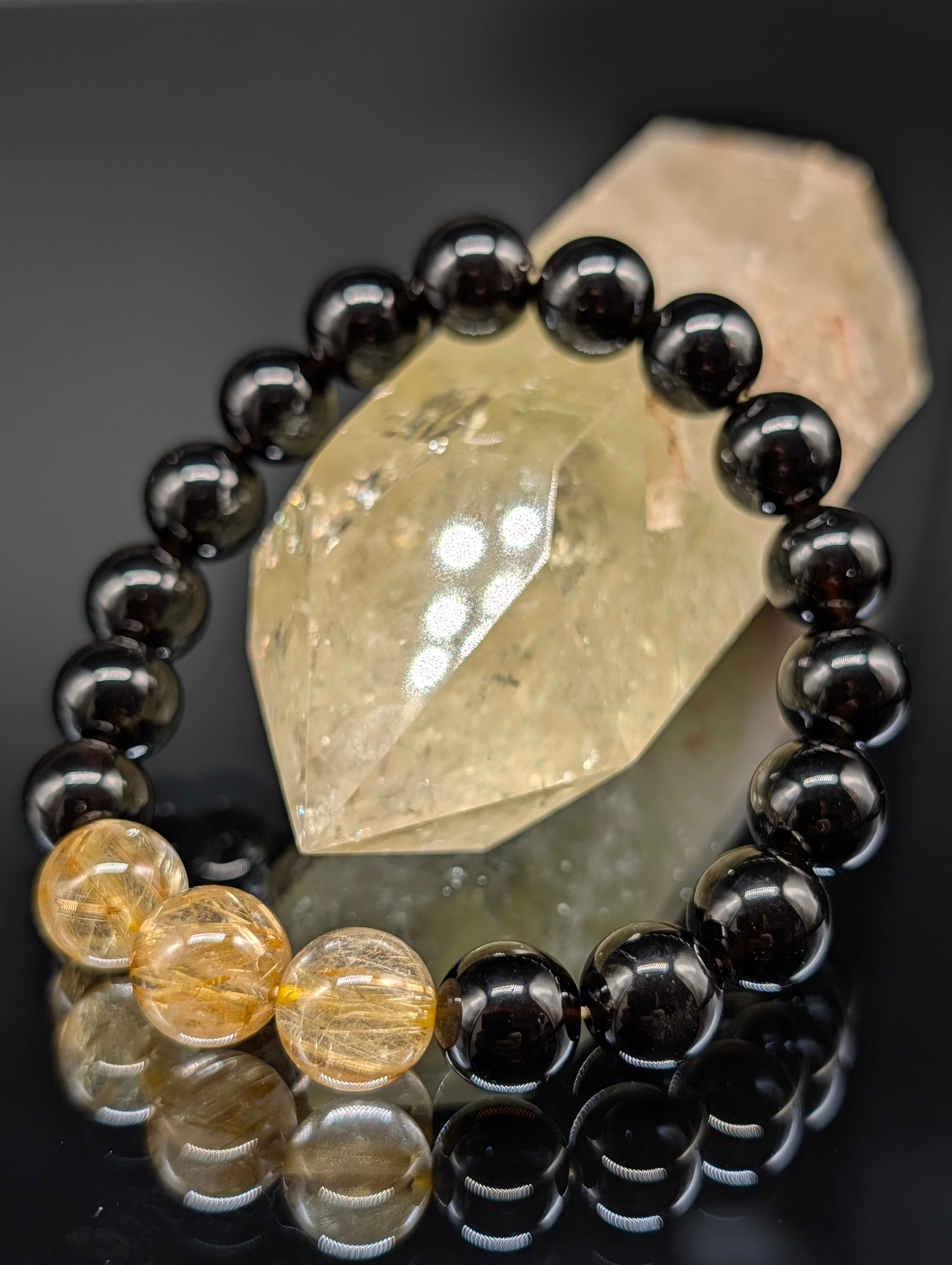 金運系の効果が高いルチルクォーツと、不幸を寄せ付けないと言われ、厄除け系の効果が高いモリオンとの組み合わせです。