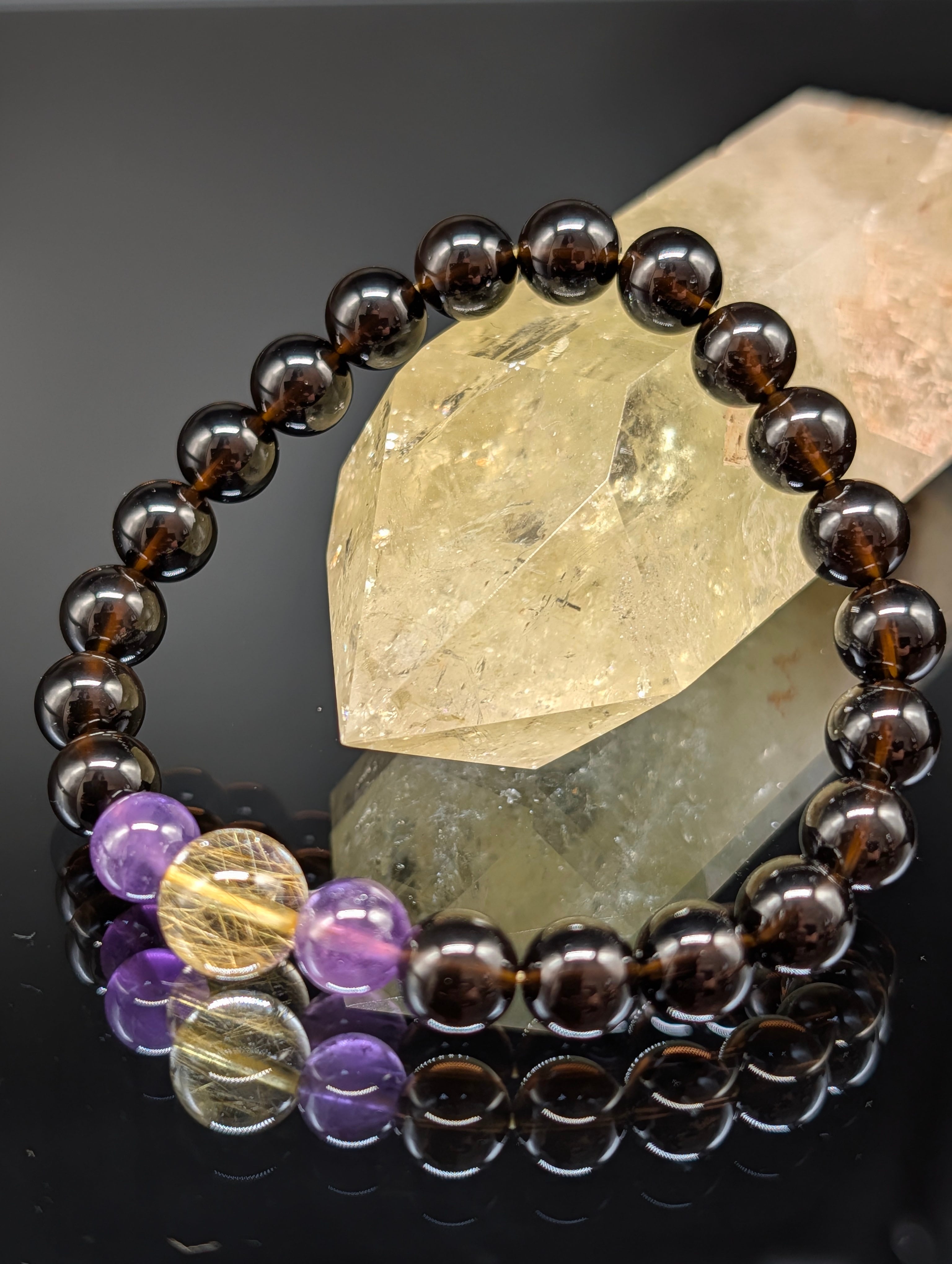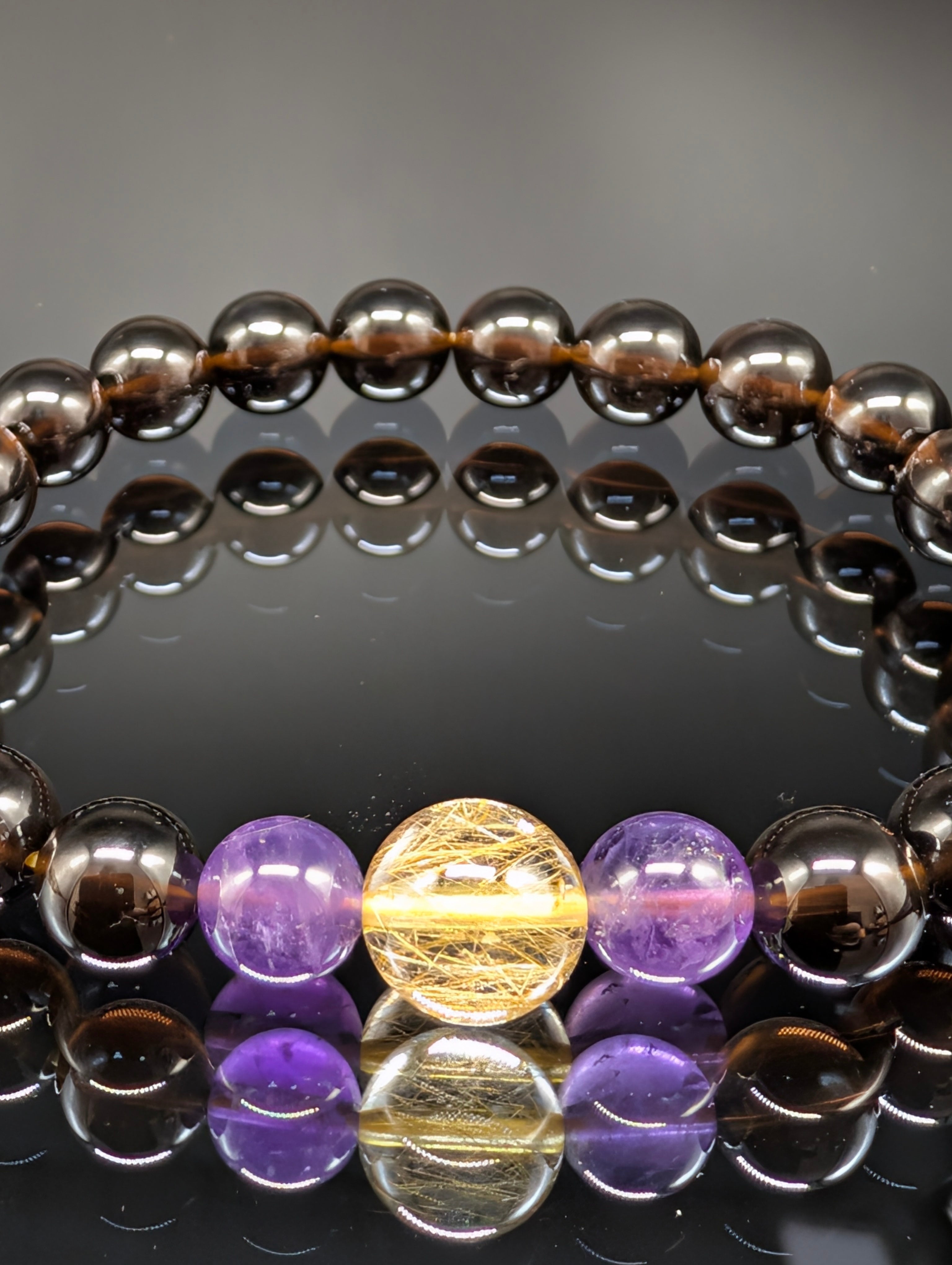 【パワーストーン】・ゴールドルチルクォーツ アメジスト モリオン 8mm 親玉10mm ブレスレット 【金運・健康運・厄除け・癒し・願望実現・高品質・鑑別済み】