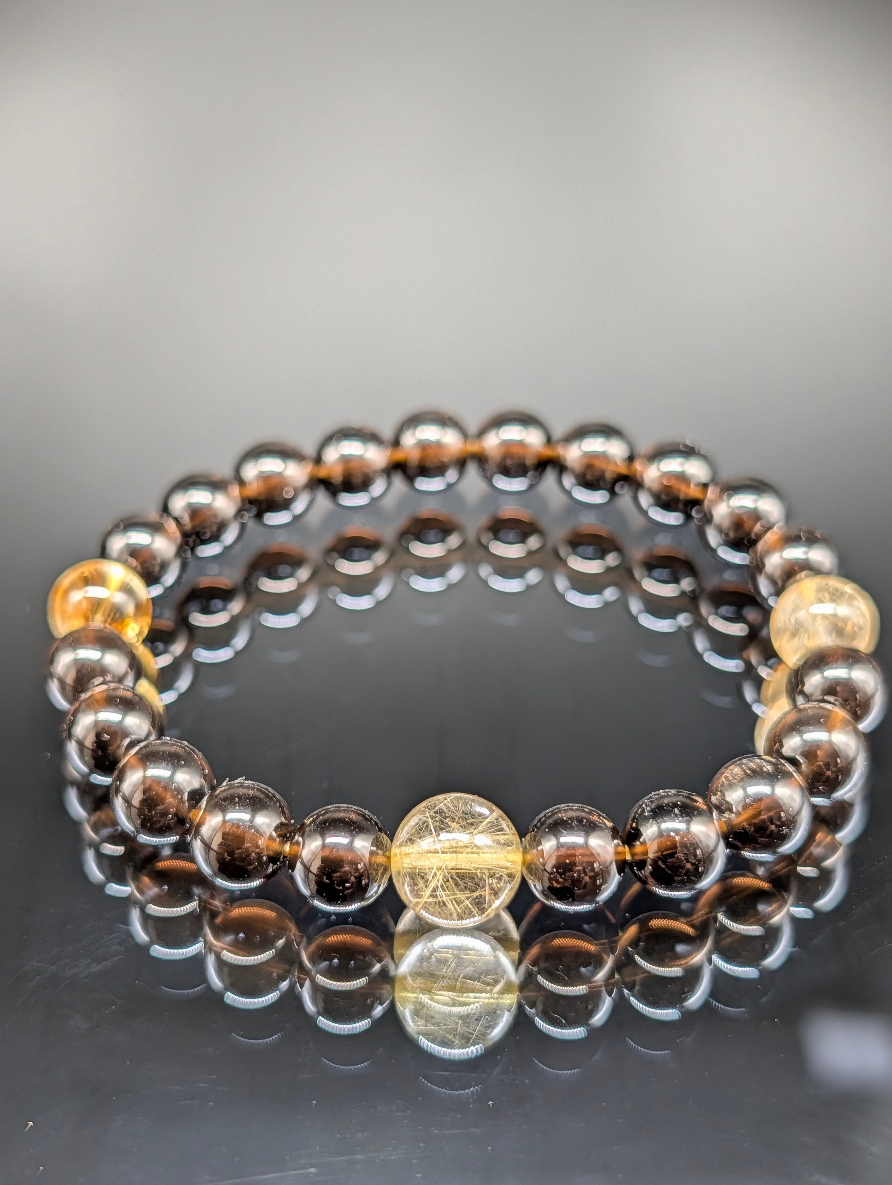 【パワーストーン】ルチルクォーツ ファントムシトリン(黄水晶) モリオン 8mm(親玉10mm) 二天 【強力守護・金運財運・願望実現・高品質・鑑別済み】ブレスレット
