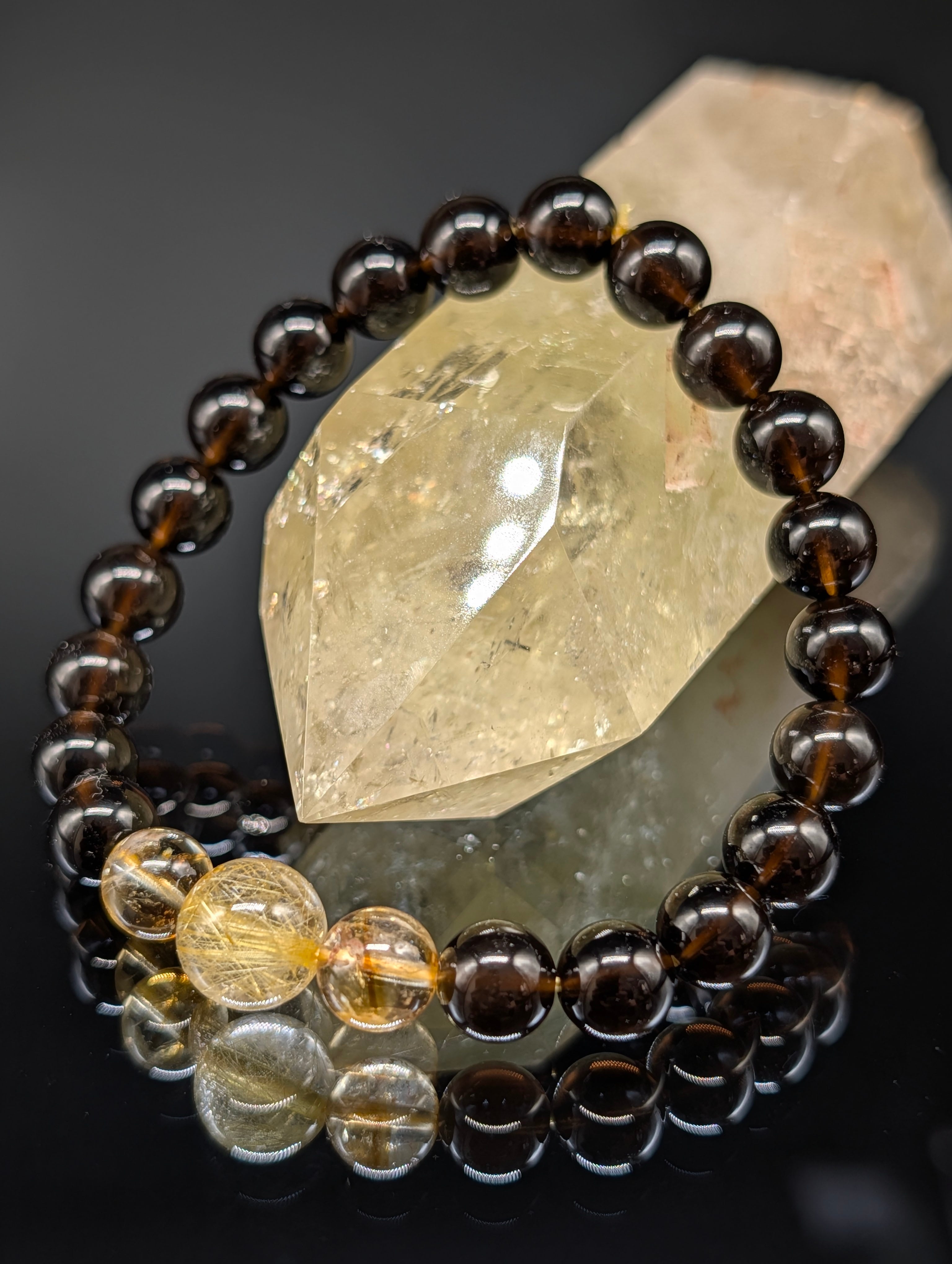 【パワーストーン】ルチルクォーツ ファントムシトリン(黄水晶) モリオン 8mm(親玉10mm) 3連 【強力守護・金運財運・願望実現・高品質・鑑別済み】ブレスレット