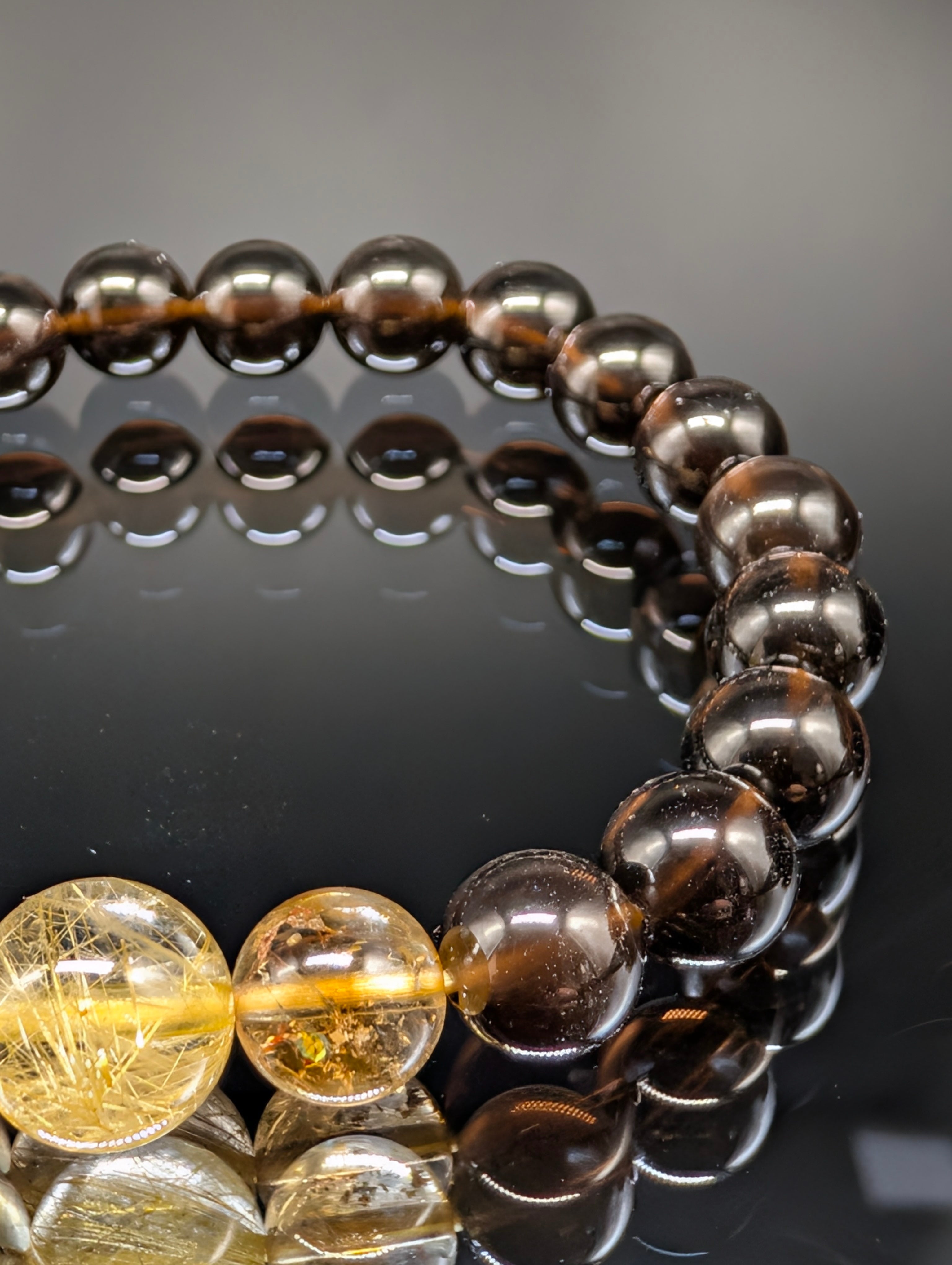 金運系の効果が最も高いルチルクォーツと、不幸を寄せ付けない厄除け系の効果が高い守護石のモリオン(黒水晶)。そこに幸運や富を引き寄せるとするシトリン(黄水晶)を組み合わせました。