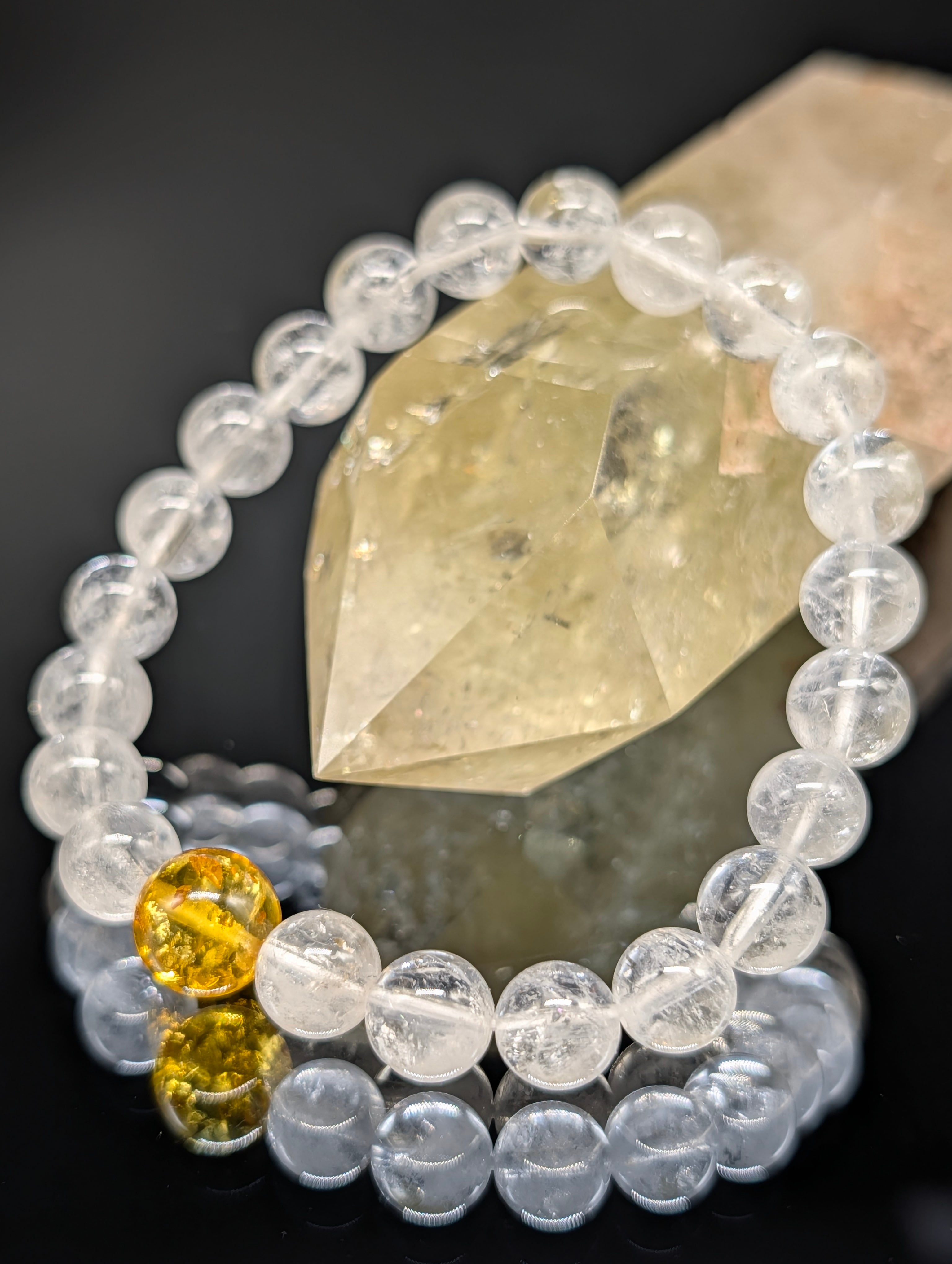 【パワーストーン】アンバー琥珀・ヒマラヤ水晶・8mm(親玉10mm)・高品質 ブレスレット 【天然琥珀・開運・願望実現・健康】