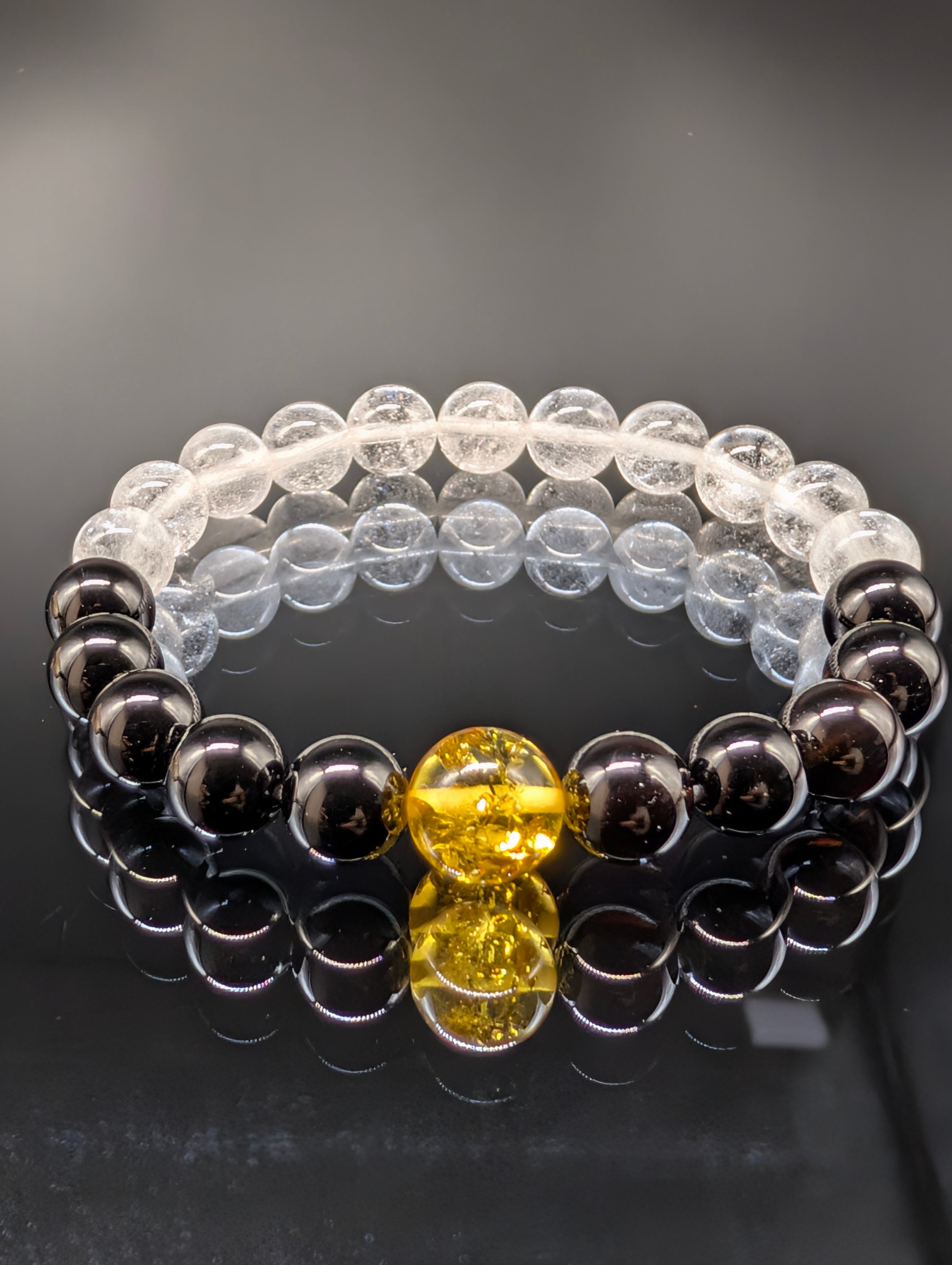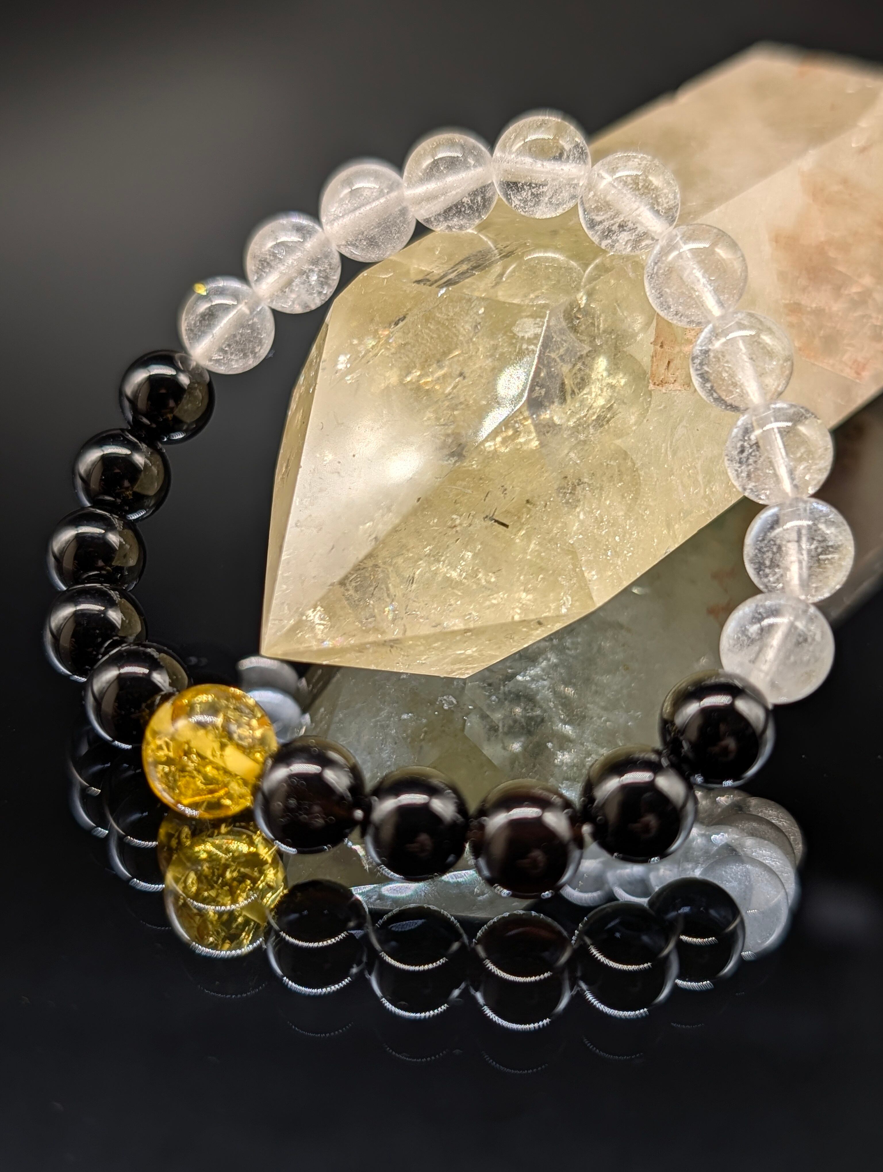 ヒマラヤ水晶とモリオン(黒水晶)とアンバー(天然琥珀)の組み合わせです。